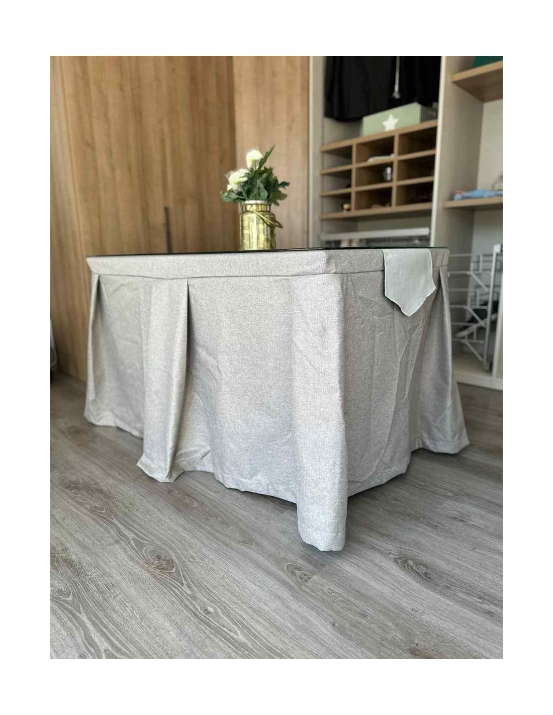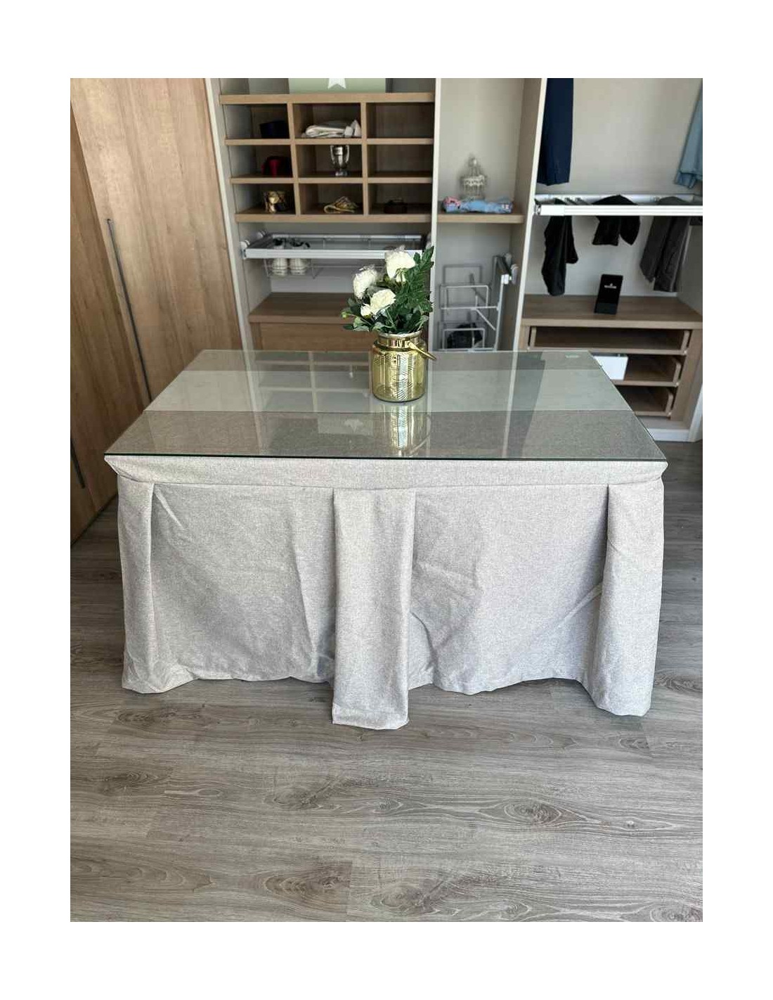 Vista su mesa de camilla con esta ropa de gran calidad y diseño italiano. Su tejido antimanchas le dará tranquilidad en el caso de que tenga pequeños o mascotas en casa. Este tipo de enaguas repele todo tipo de líquidos y evita, de esta manera, que la mancha llegue a quedarse impregnada en el tejido.