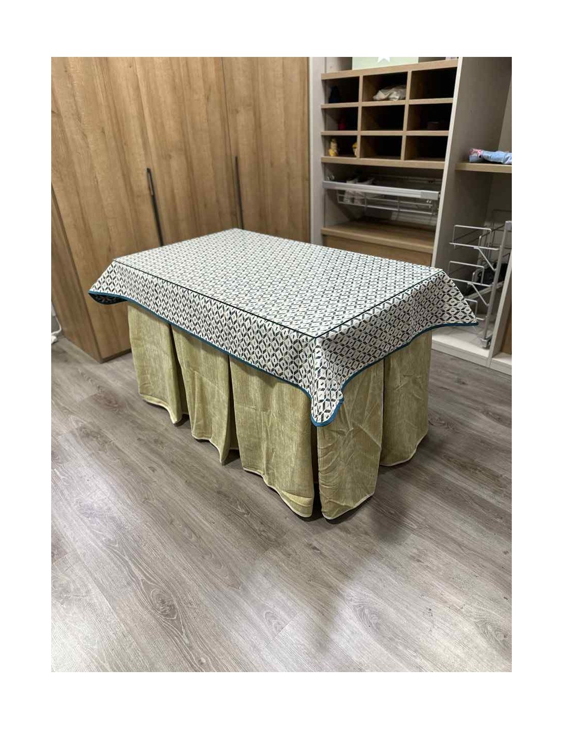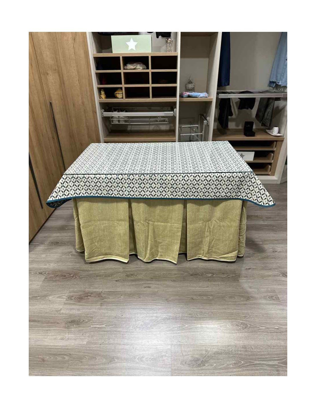 Confeccionada con 10 pliegues para mantener el calor de manera eficiente. Las tablas comunmente llamados pliegues, favorecen la retención de la temperatura impidiendo escapar el calor cuando nos sentamos en la mesa y nos cubrimos con ella. Gracias a nuestro diseño en los fuelles la falda de mesa camilla caerá cubriéndono los laterales e impidiendo que escape el calor.
