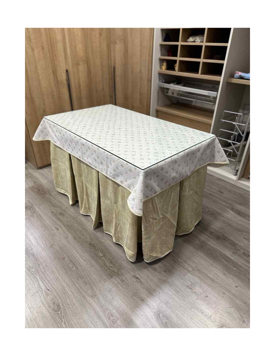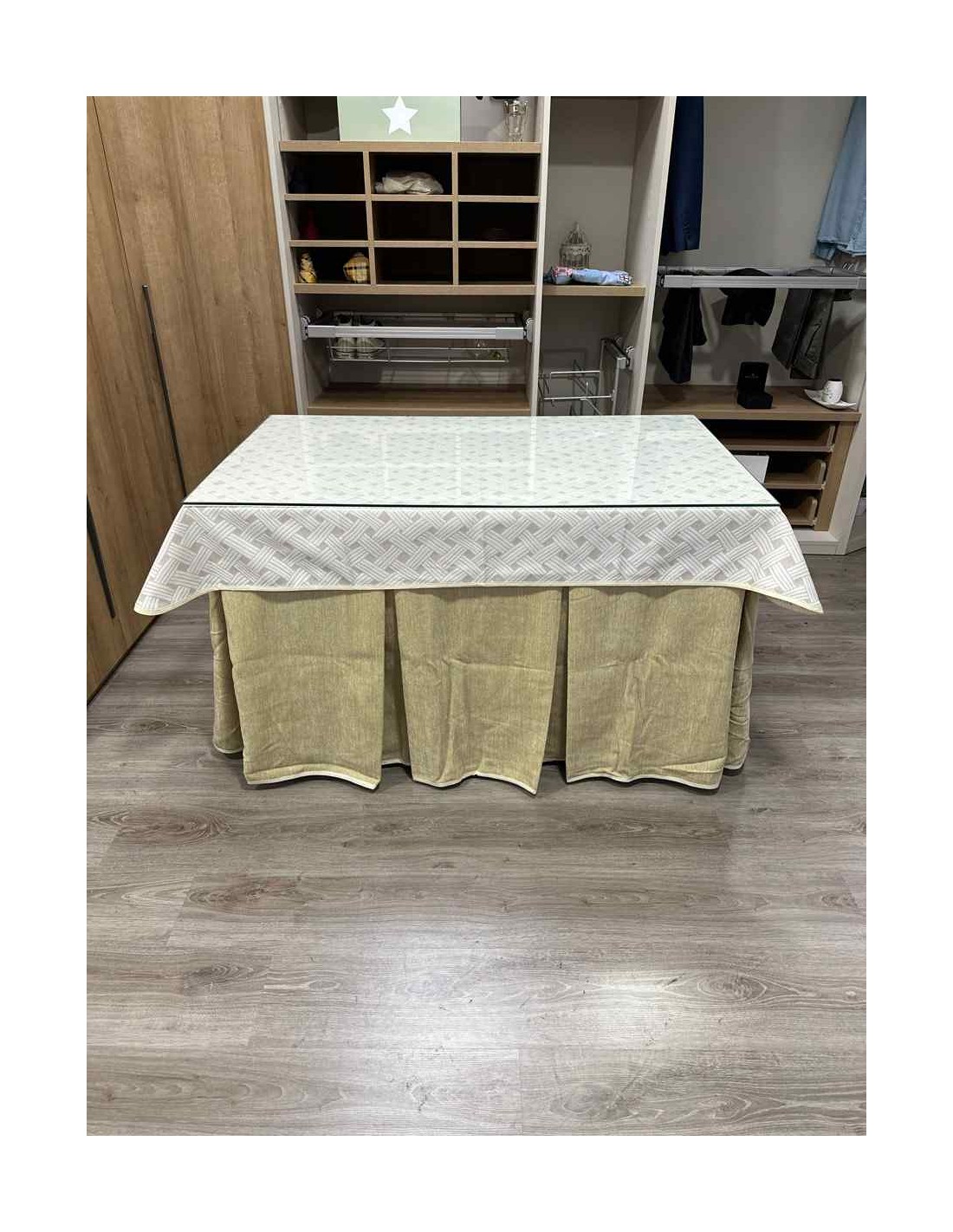 Confeccionada con 10 pliegues para mantener el calor de manera eficiente. Las tablas comunmente llamados pliegues, favorecen la retención de la temperatura impidiendo escapar el calor cuando nos sentamos en la mesa y nos cubrimos con ella. Gracias a nuestro diseño en los fuelles la falda de mesa camilla caerá cubriéndono los laterales e impidiendo que escape el calor.