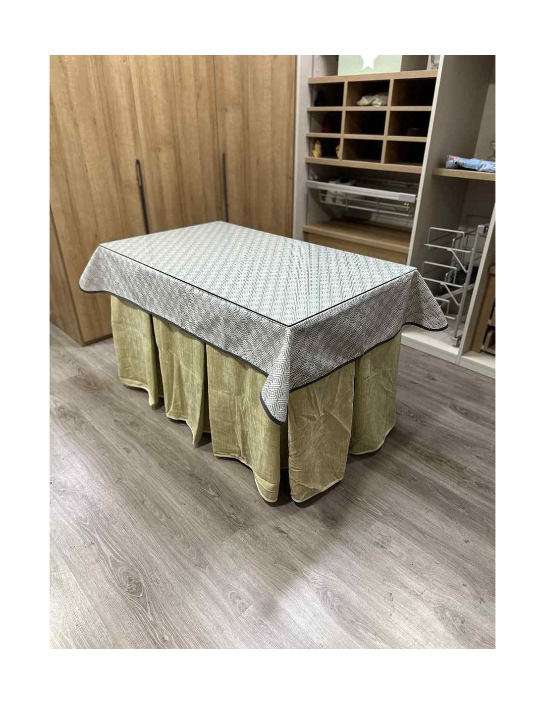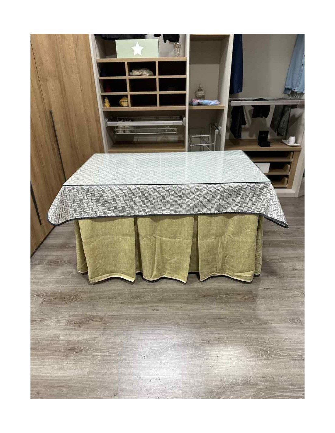 Confeccionada con 10 pliegues para mantener el calor de manera eficiente. Las tablas comunmente llamados pliegues, favorecen la retención de la temperatura impidiendo escapar el calor cuando nos sentamos en la mesa y nos cubrimos con ella. Gracias a nuestro diseño en los fuelles la falda de mesa camilla caerá cubriéndono los laterales e impidiendo que escape el calor.