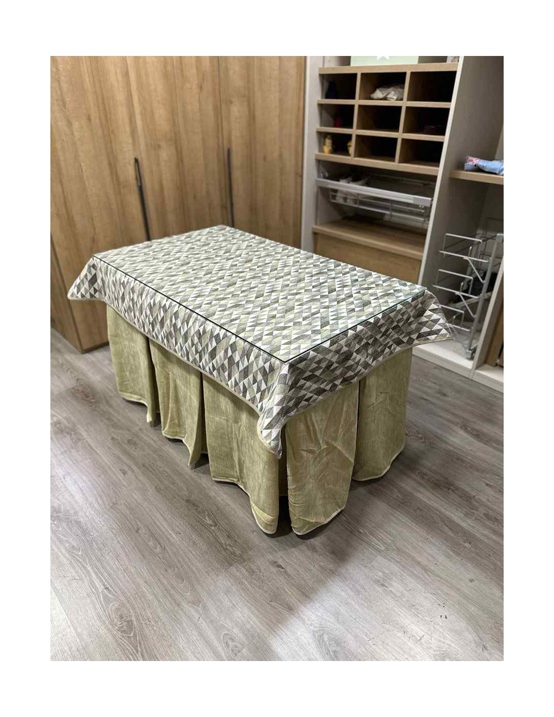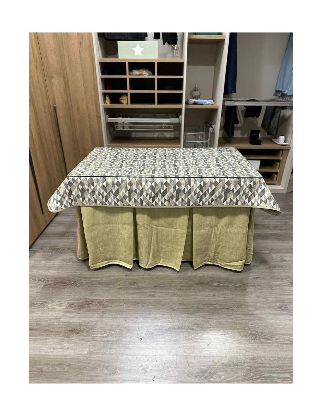 Confeccionada con 10 pliegues para mantener el calor de manera eficiente. Las tablas comunmente llamados pliegues, favorecen la retención de la temperatura impidiendo escapar el calor cuando nos sentamos en la mesa y nos cubrimos con ella. Gracias a nuestro diseño en los fuelles la falda de mesa camilla caerá cubriéndono los laterales e impidiendo que escape el calor.