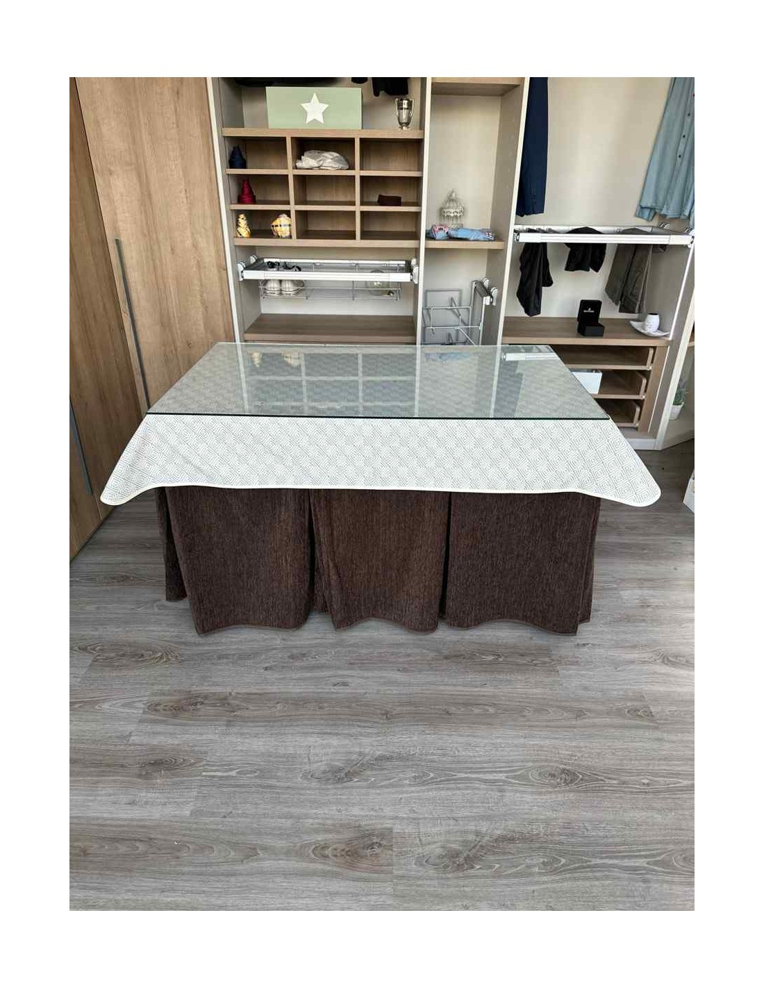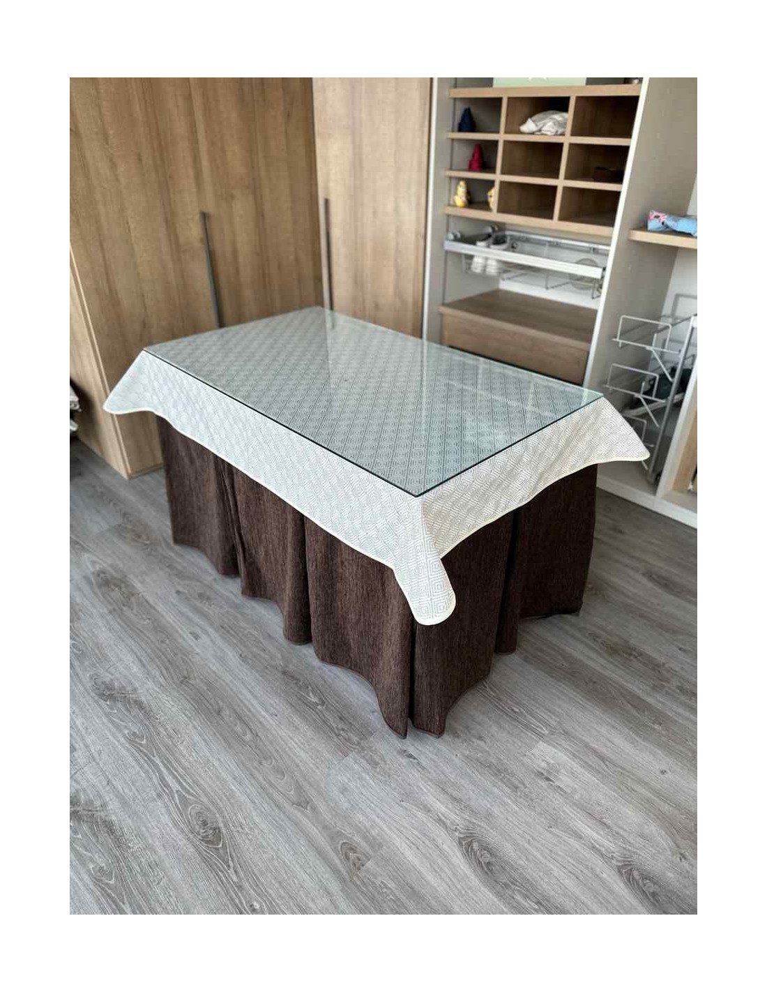 Confeccionada con 10 pliegues para mantener el calor de manera eficiente. Las tablas comunmente llamados pliegues, favorecen la retención de la temperatura impidiendo escapar el calor cuando nos sentamos en la mesa y nos cubrimos con ella. Gracias a nuestro diseño en los fuelles la falda de mesa camilla caerá cubriéndono los laterales e impidiendo que escape el calor.