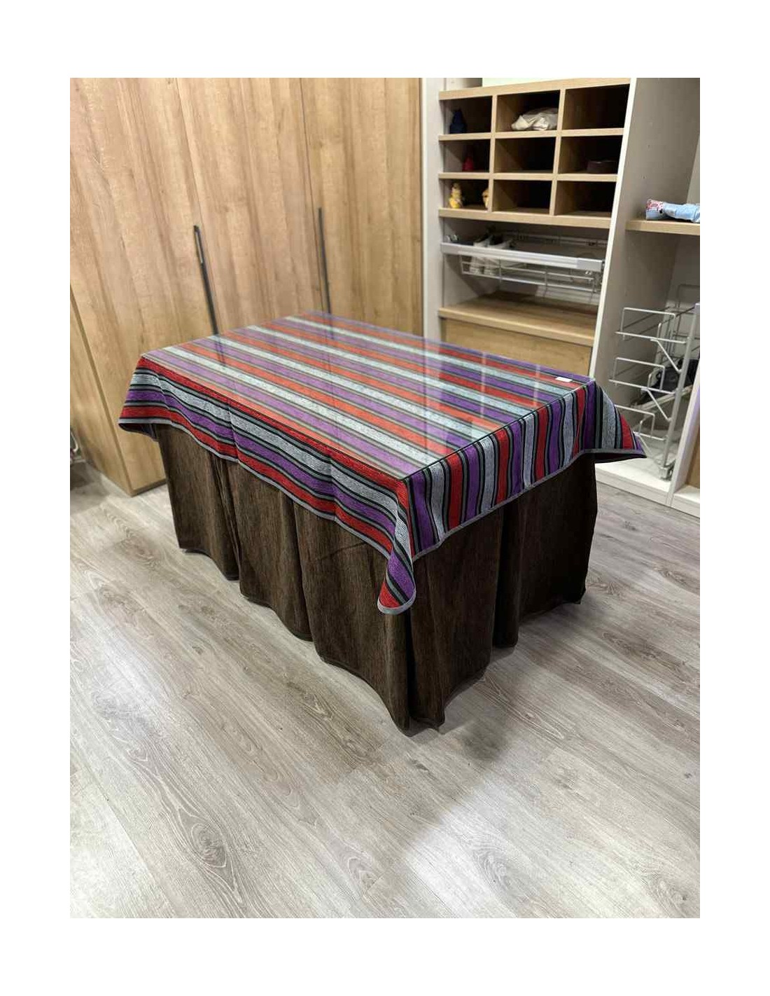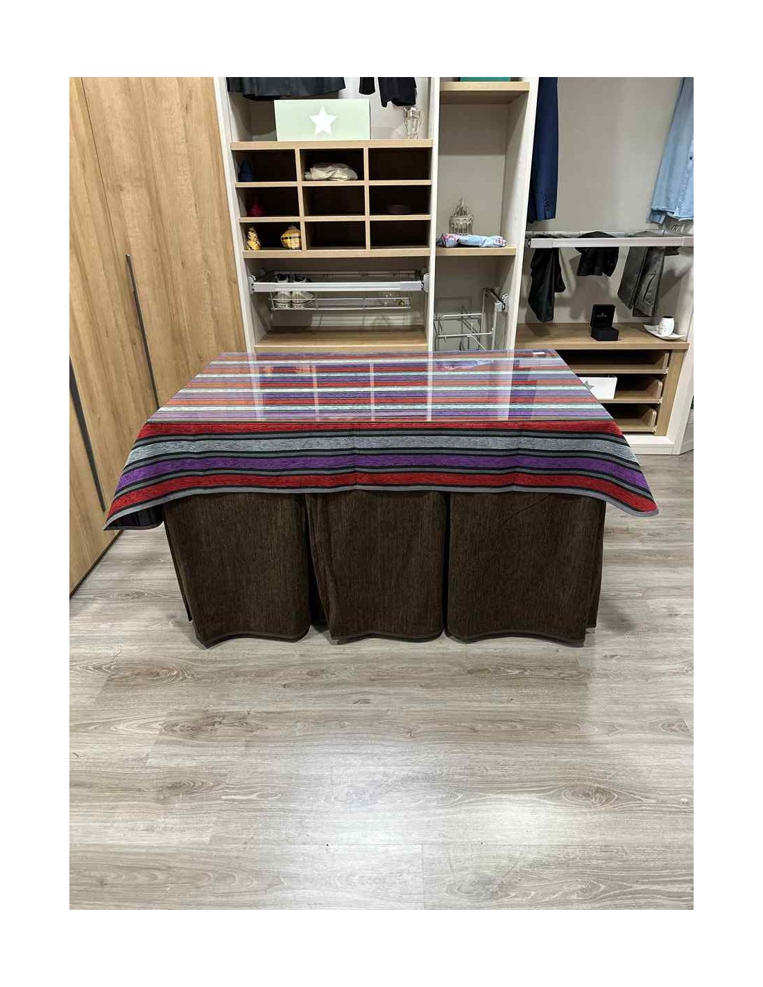 Confeccionada con 10 pliegues para mantener el calor de manera eficiente. Las tablas comunmente llamados pliegues, favorecen la retención de la temperatura impidiendo escapar el calor cuando nos sentamos en la mesa y nos cubrimos con ella. Gracias a nuestro diseño en los fuelles la falda de mesa camilla caerá cubriéndono los laterales e impidiendo que escape el calor.