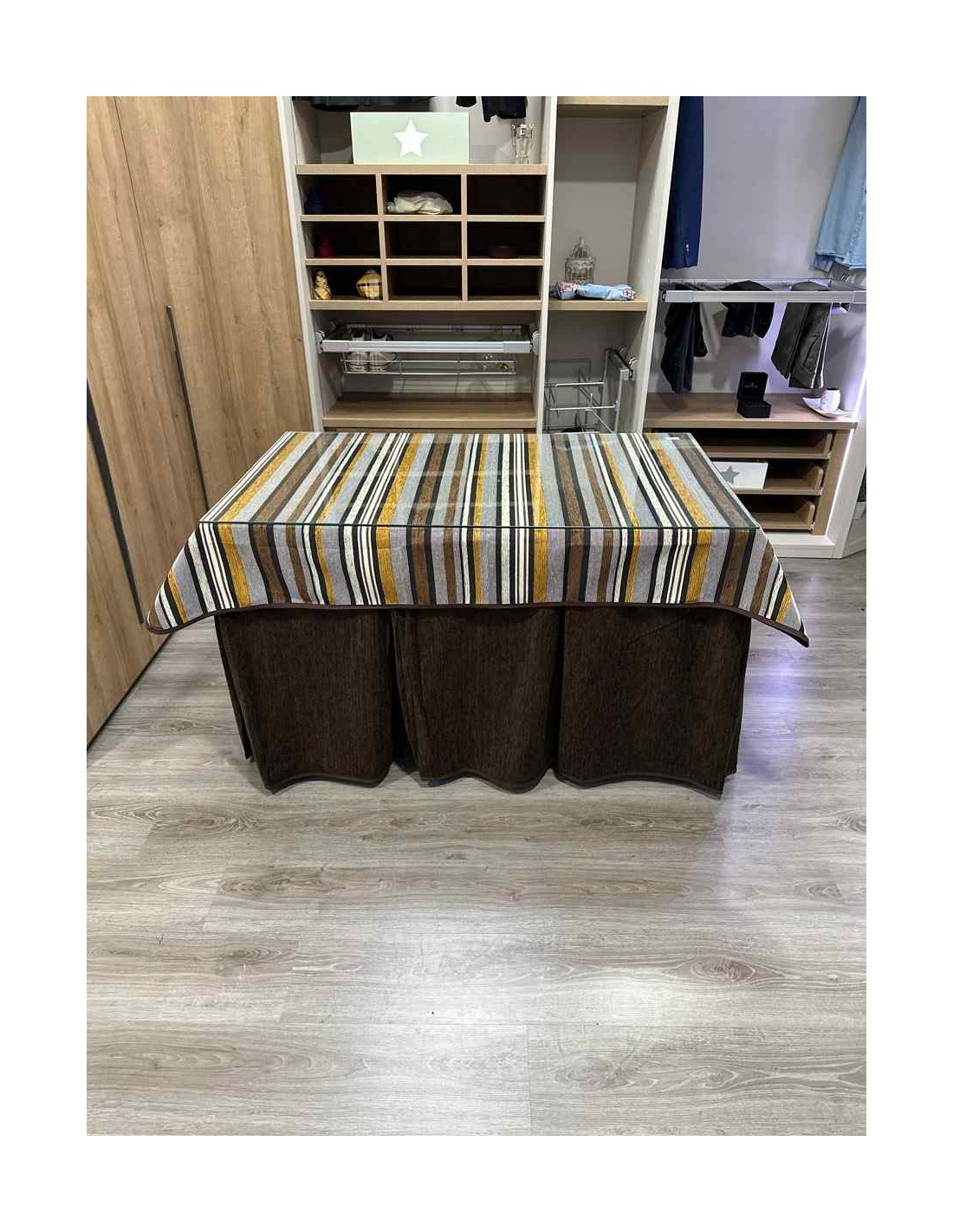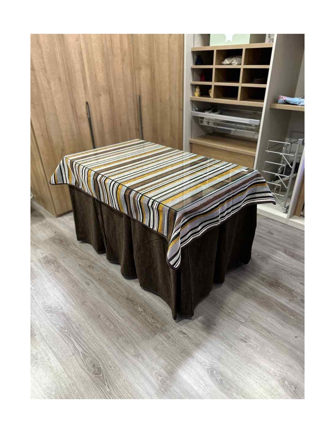 Confeccionada con 10 pliegues para mantener el calor de manera eficiente. Las tablas comunmente llamados pliegues, favorecen la retención de la temperatura impidiendo escapar el calor cuando nos sentamos en la mesa y nos cubrimos con ella. Gracias a nuestro diseño en los fuelles la falda de mesa camilla caerá cubriéndono los laterales e impidiendo que escape el calor.