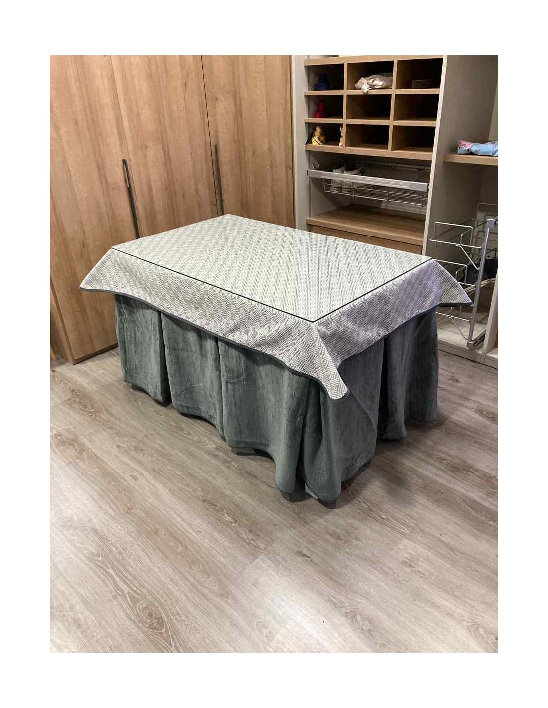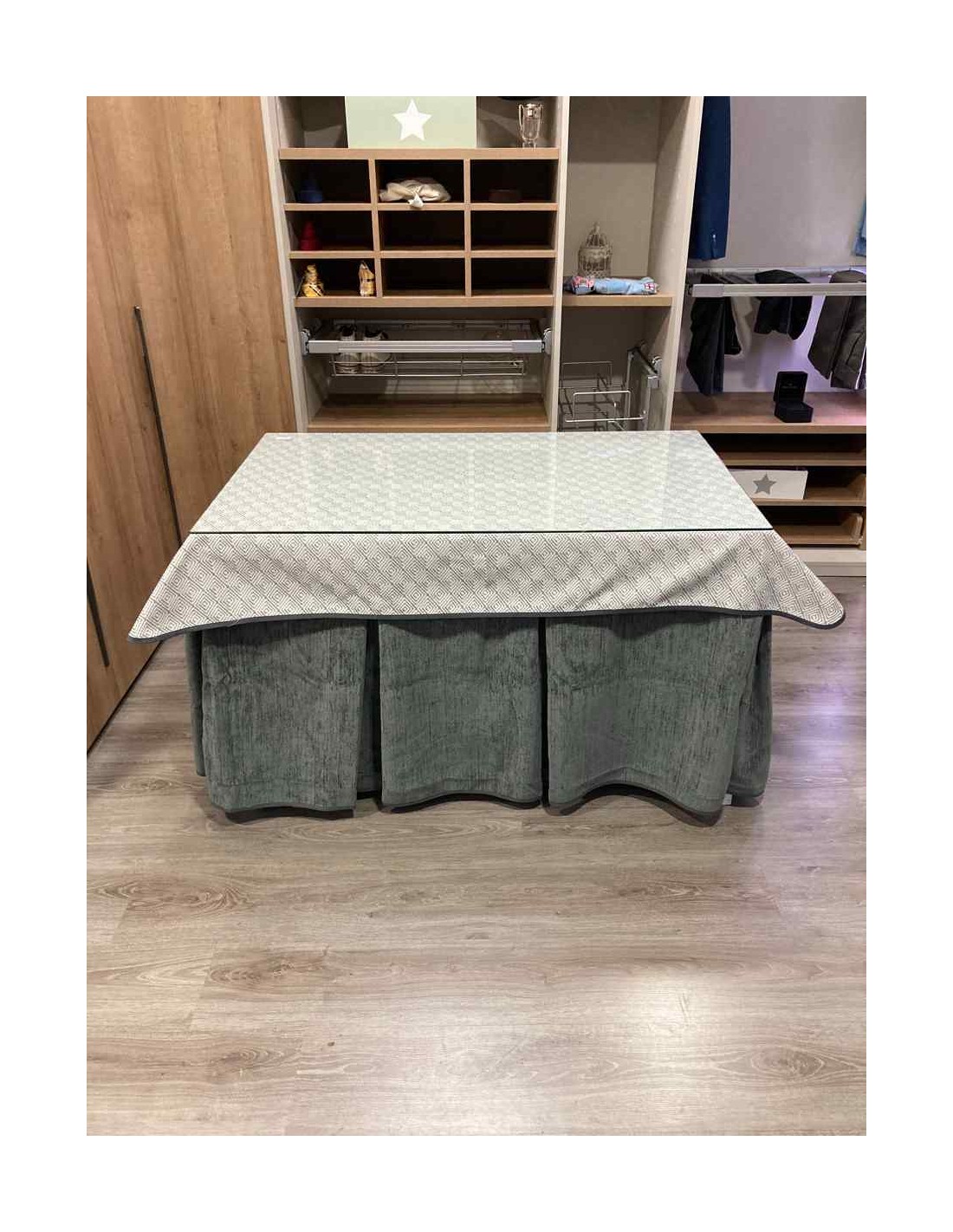 Confeccionada con 10 pliegues para mantener el calor de manera eficiente. Las tablas comunmente llamados pliegues, favorecen la retención de la temperatura impidiendo escapar el calor cuando nos sentamos en la mesa y nos cubrimos con ella. Gracias a nuestro diseño en los fuelles la falda de mesa camilla caerá cubriéndono los laterales e impidiendo que escape el calor.