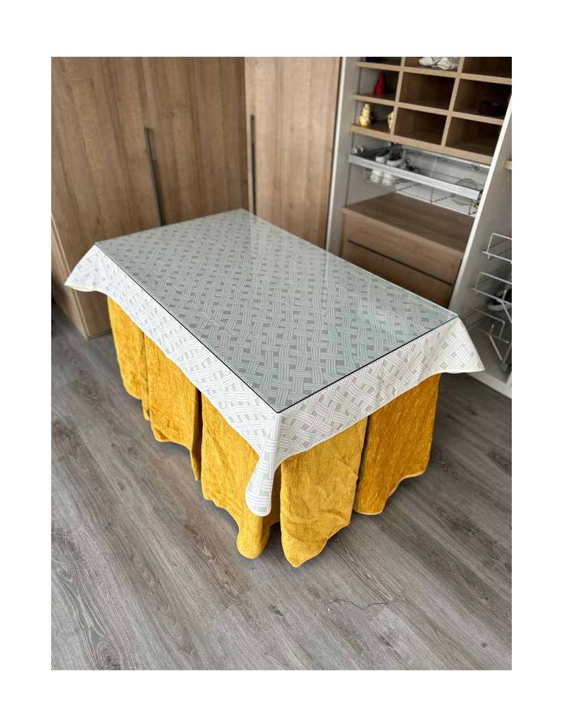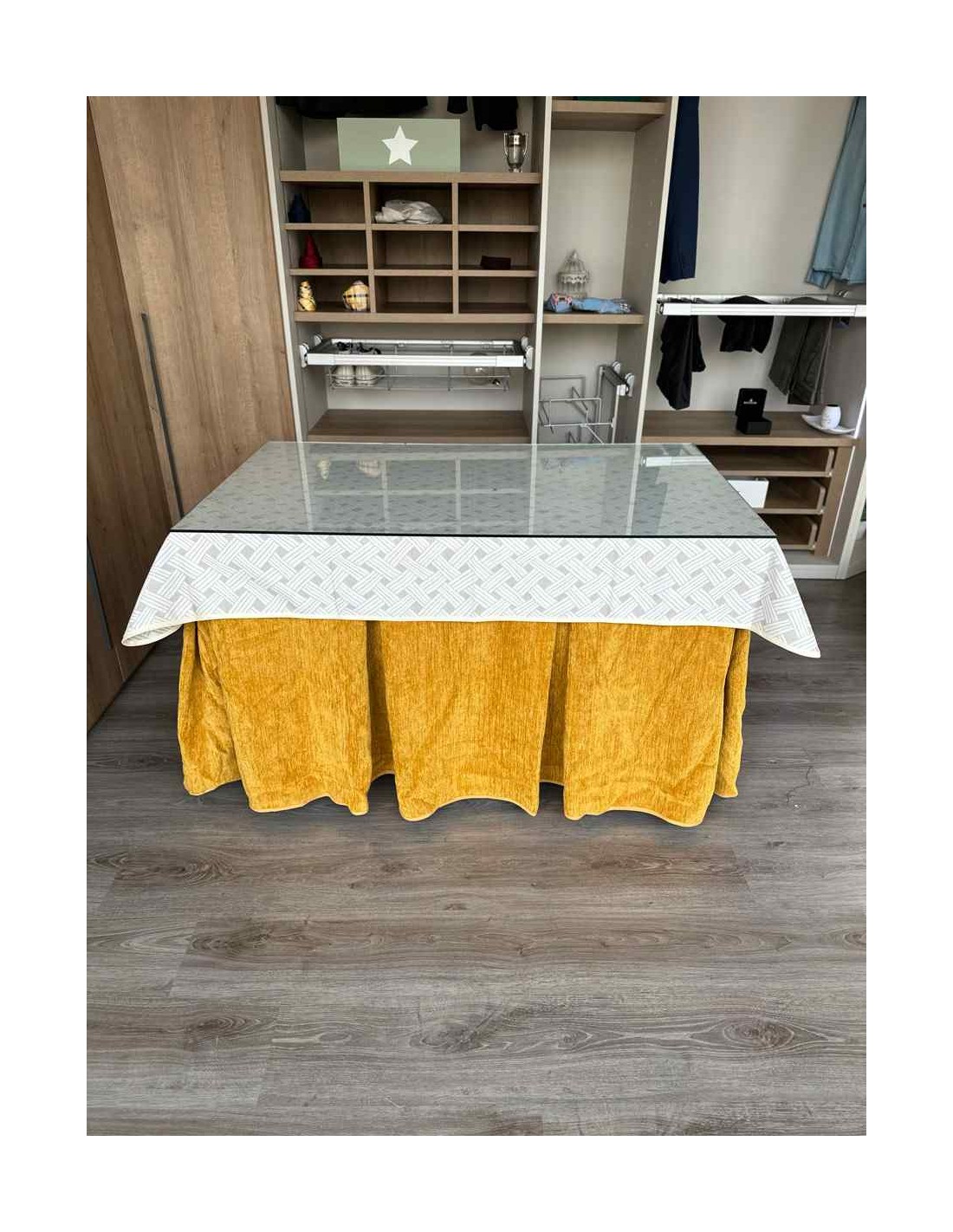Confeccionada con 10 pliegues para mantener el calor de manera eficiente. Las tablas comunmente llamados pliegues, favorecen la retención de la temperatura impidiendo escapar el calor cuando nos sentamos en la mesa y nos cubrimos con ella. Gracias a nuestro diseño en los fuelles la falda de mesa camilla caerá cubriéndono los laterales e impidiendo que escape el calor.