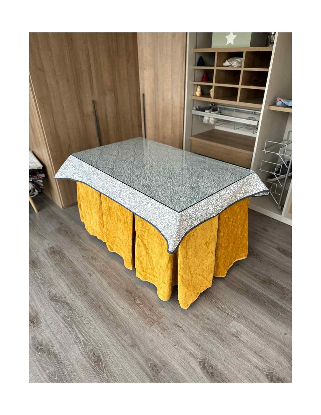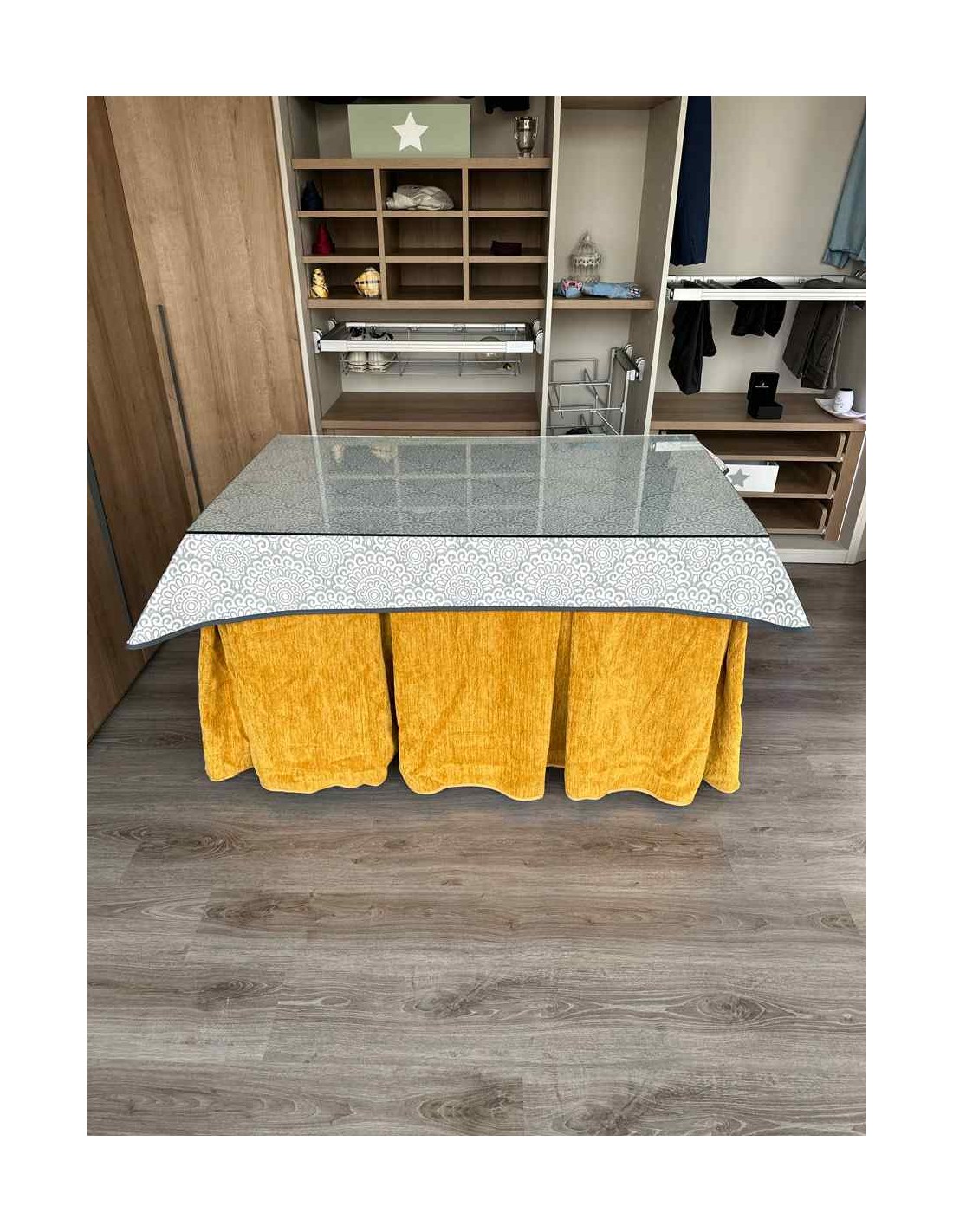 Confeccionada con 10 pliegues para mantener el calor de manera eficiente. Las tablas comunmente llamados pliegues, favorecen la retención de la temperatura impidiendo escapar el calor cuando nos sentamos en la mesa y nos cubrimos con ella. Gracias a nuestro diseño en los fuelles la falda de mesa camilla caerá cubriéndono los laterales e impidiendo que escape el calor.
