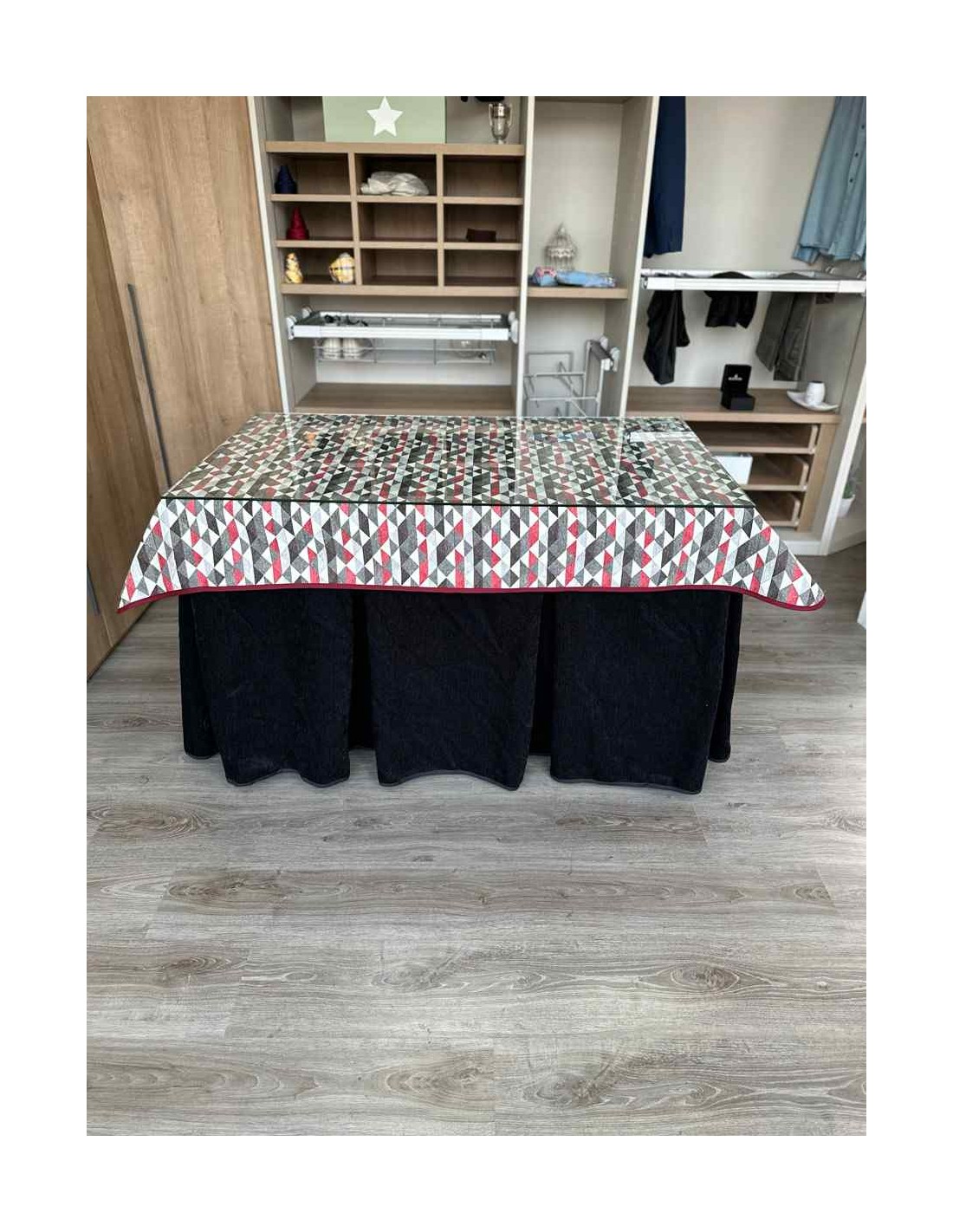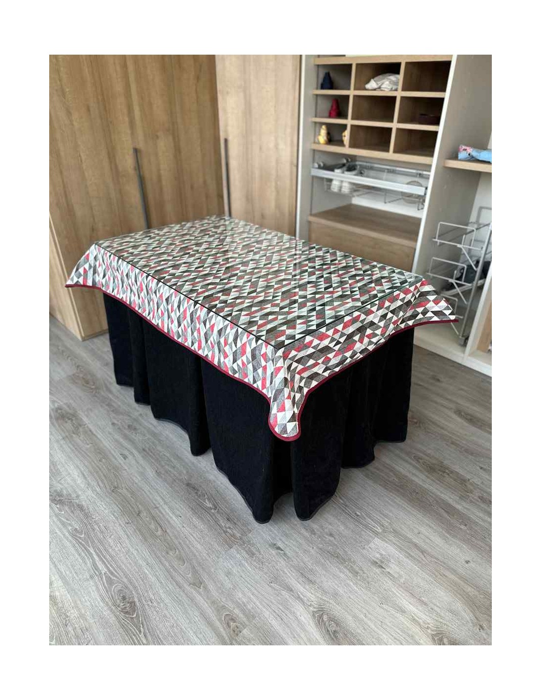 Confeccionada con 10 pliegues para mantener el calor de manera eficiente. Las tablas comunmente llamados pliegues, favorecen la retención de la temperatura impidiendo escapar el calor cuando nos sentamos en la mesa y nos cubrimos con ella. Gracias a nuestro diseño en los fuelles la falda de mesa camilla caerá cubriéndono los laterales e impidiendo que escape el calor.