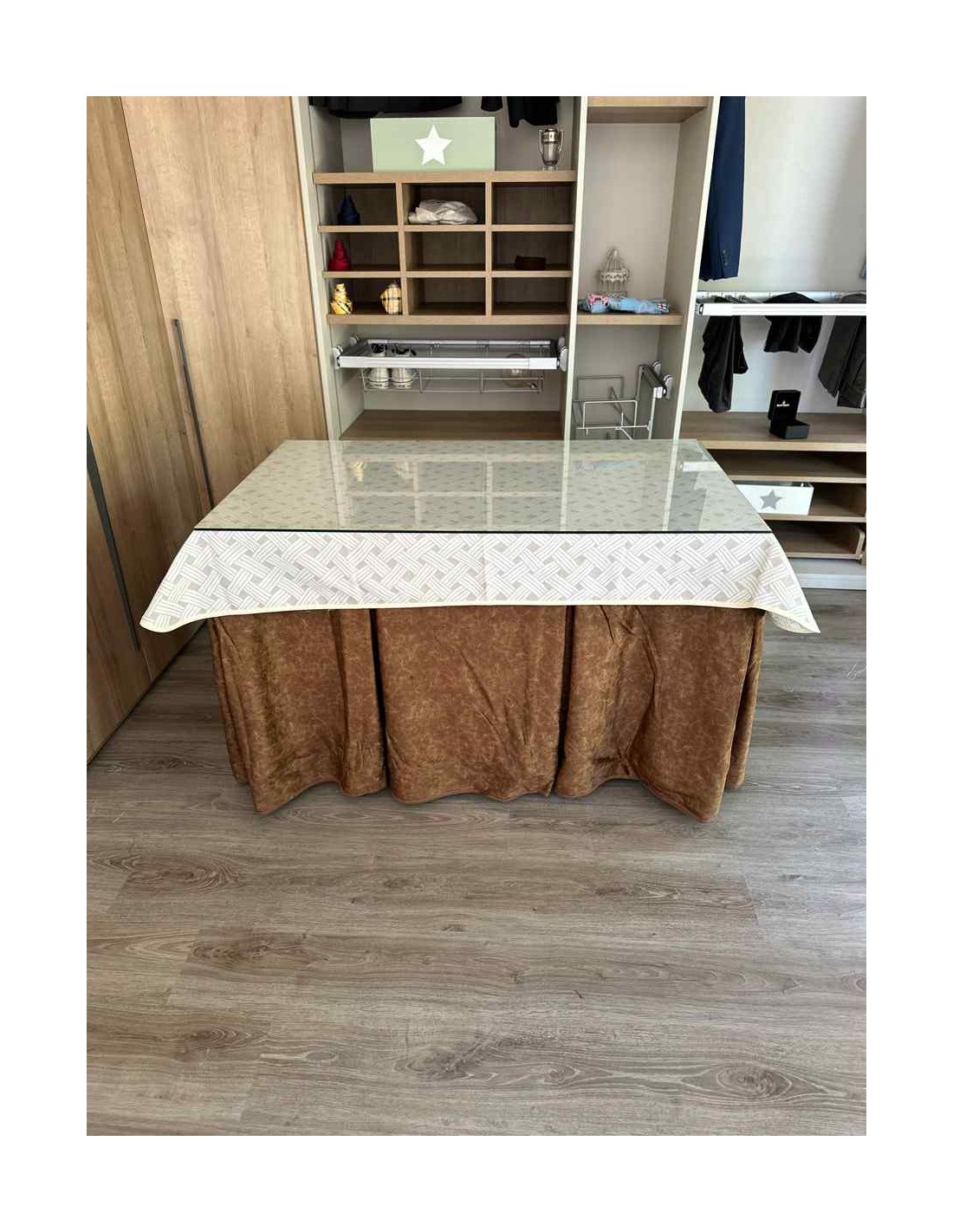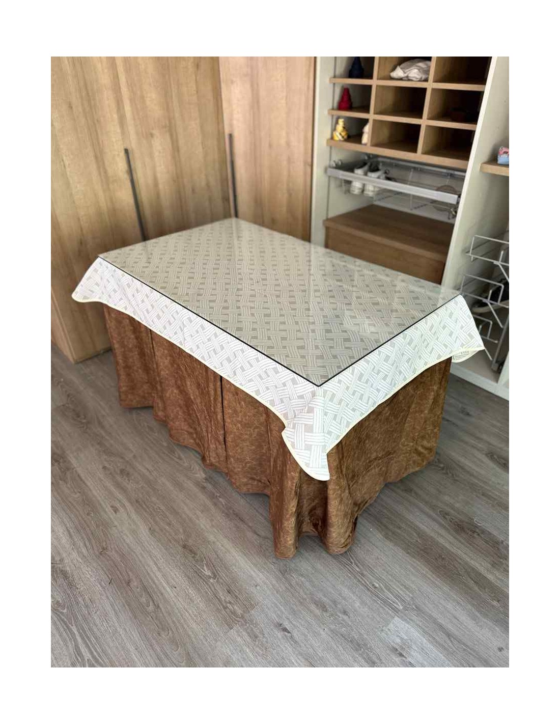 Vista su mesa de camilla con esta ropa de gran calidad y con interior de forro de borrego que le permite calentarse sin radiador ahorrando luz este invierno.