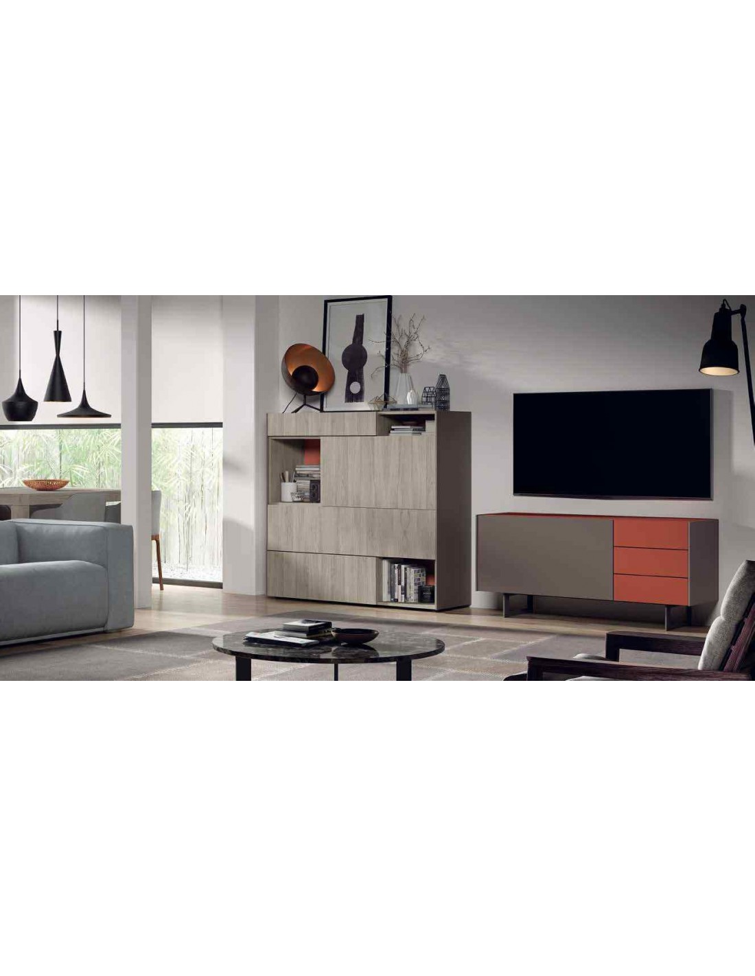 Salon diseño moderno mezcla de madera con varios colores con estantes y aparadores a juego (10)