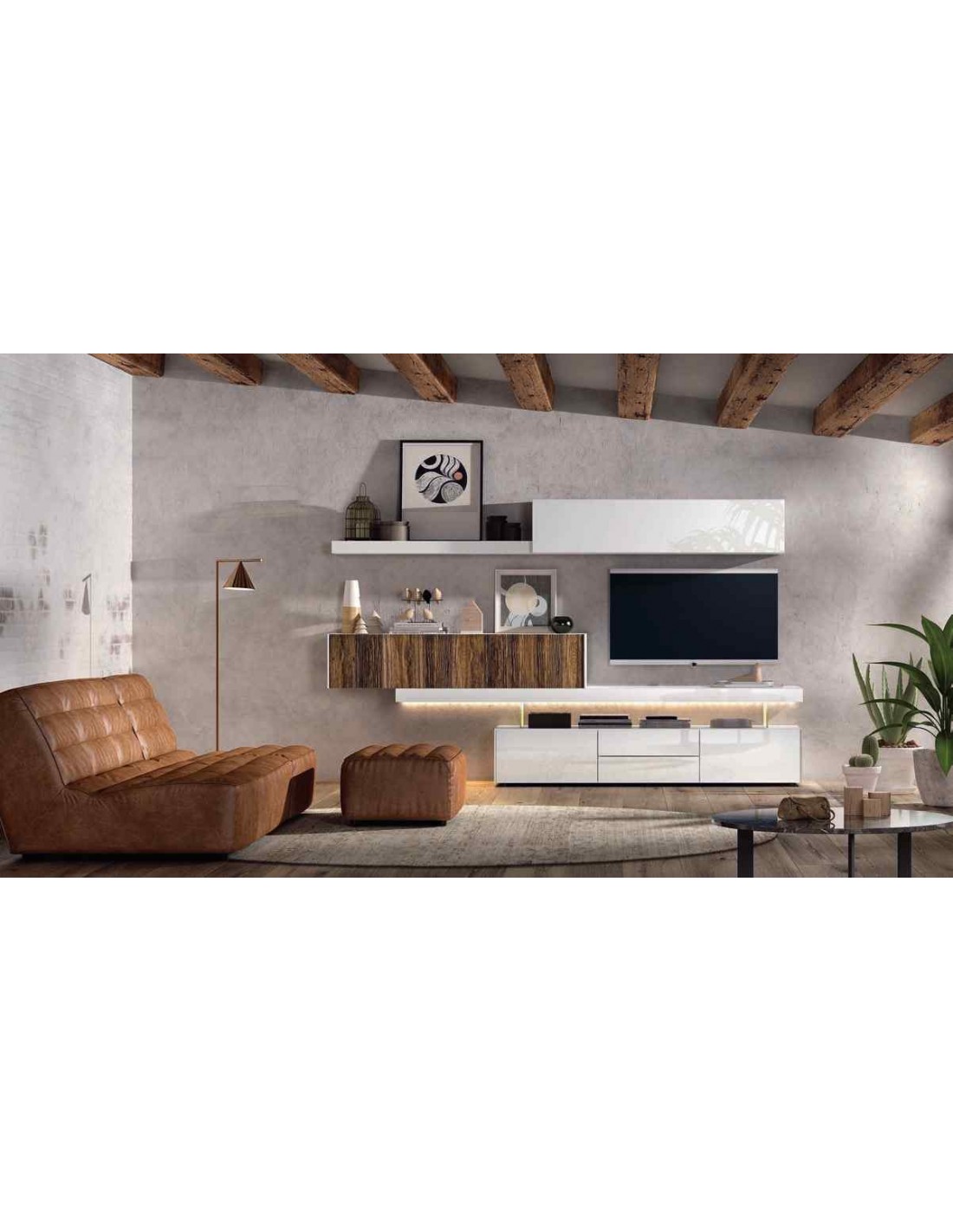 Salon diseño moderno mezcla de madera con varios colores con estantes y aparadores a juego (3)