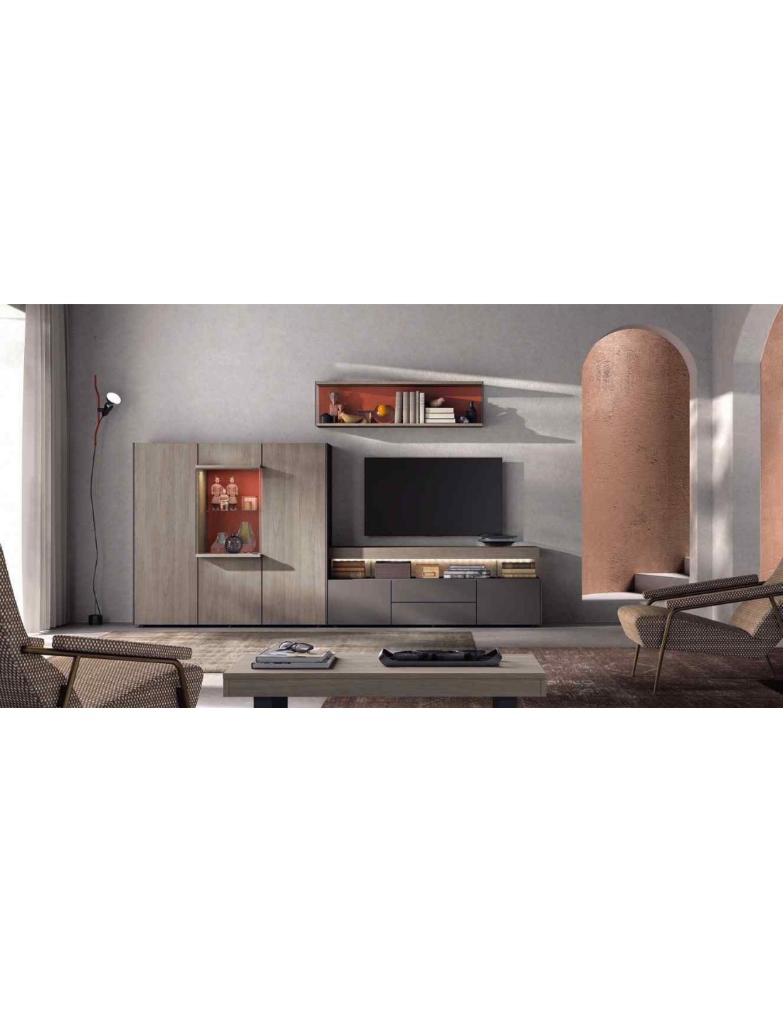 Salon diseño moderno mezcla de madera con varios colores con estantes y aparadores a juego (6)