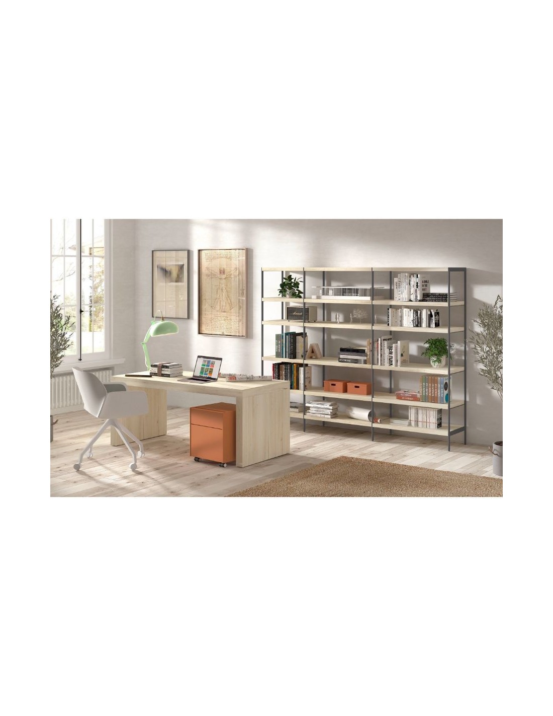 Modelo de estantería con costados metálicos y conjunto de estantes librería