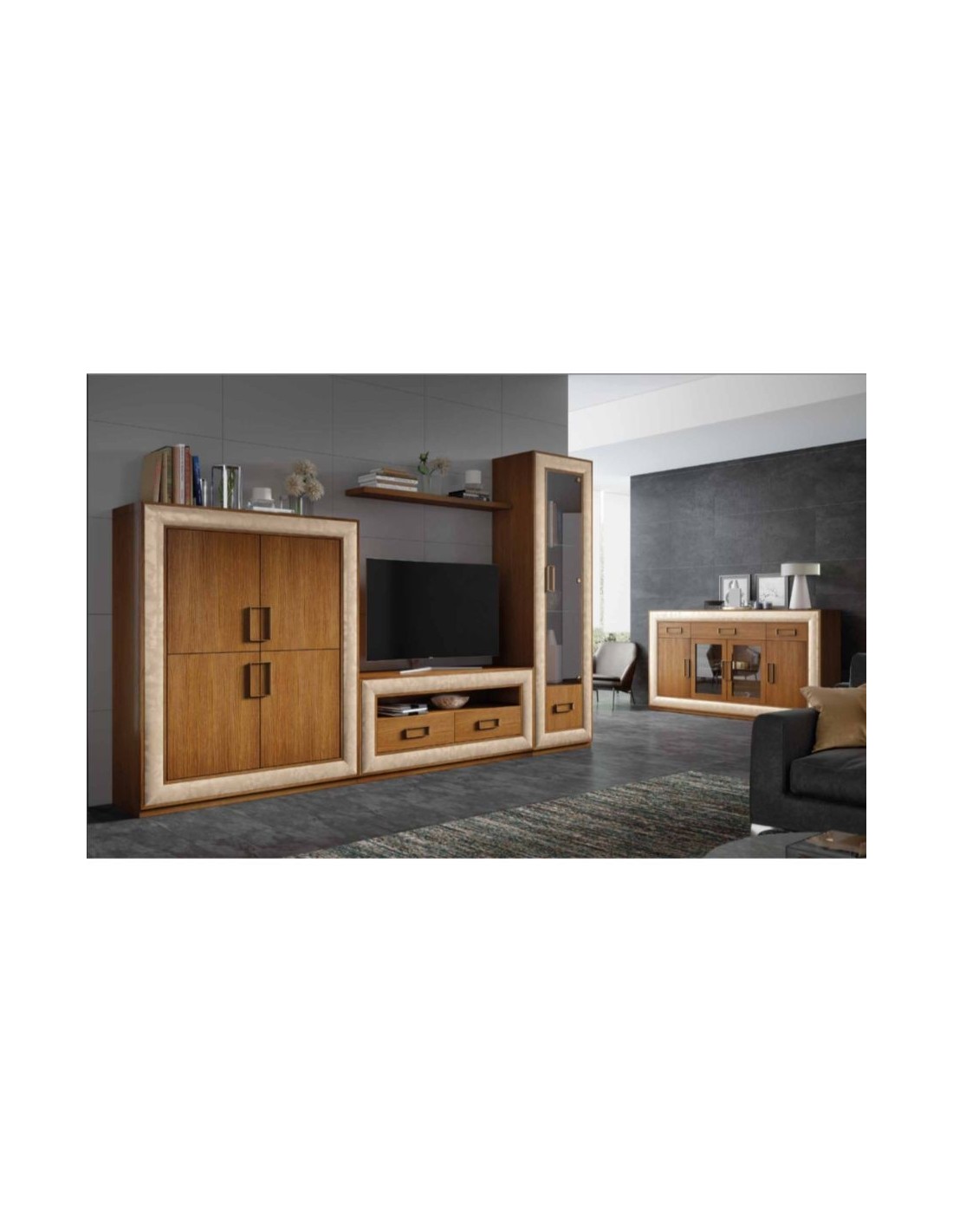 Salon modular diseño moderno con diferentes acabados de color con vitrinas de cristal anchas y estrechas y bajos de tv (18)