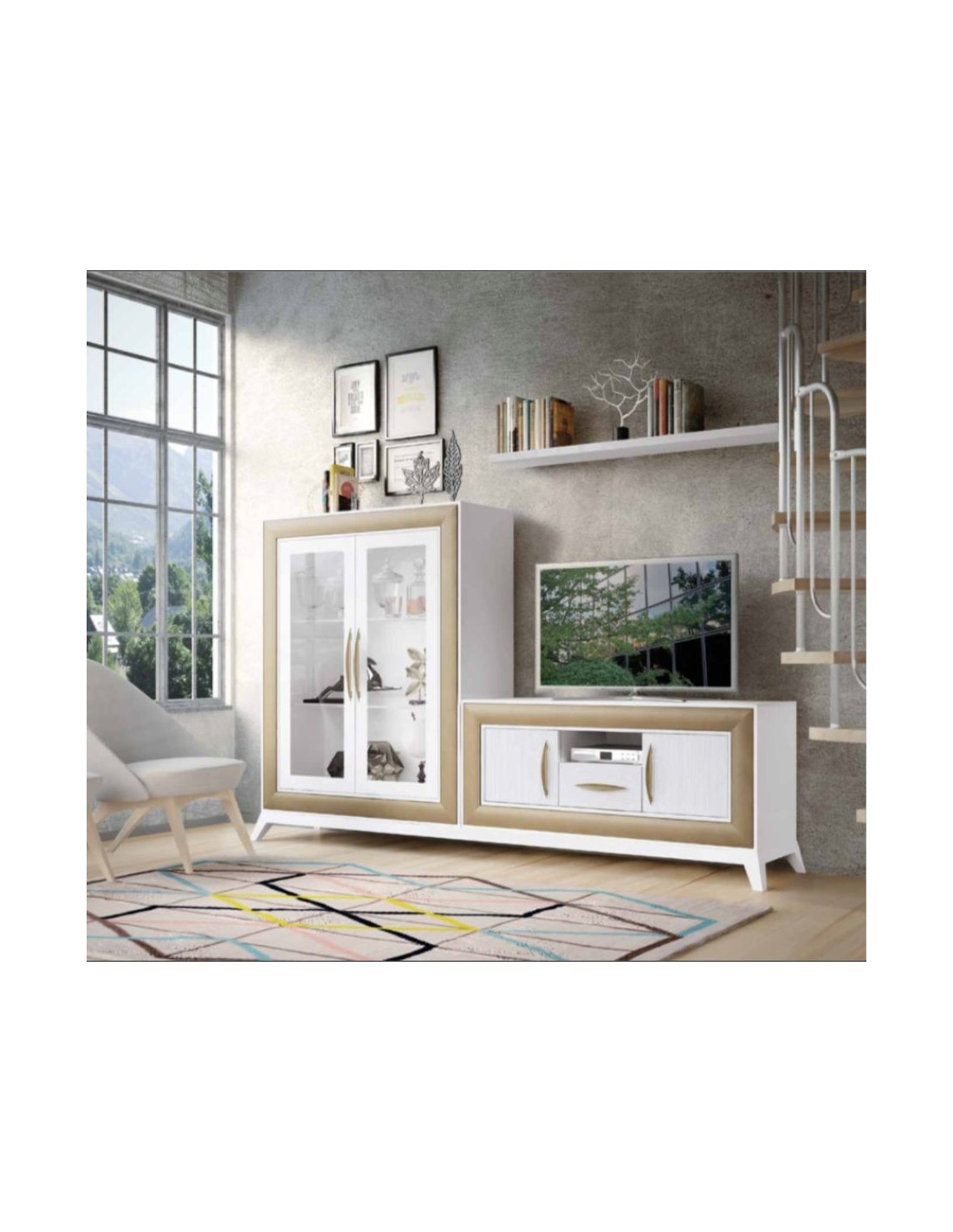 Salon modular diseño moderno con diferentes acabados de color con vitrinas de cristal anchas y estrechas y bajos de tv (5)