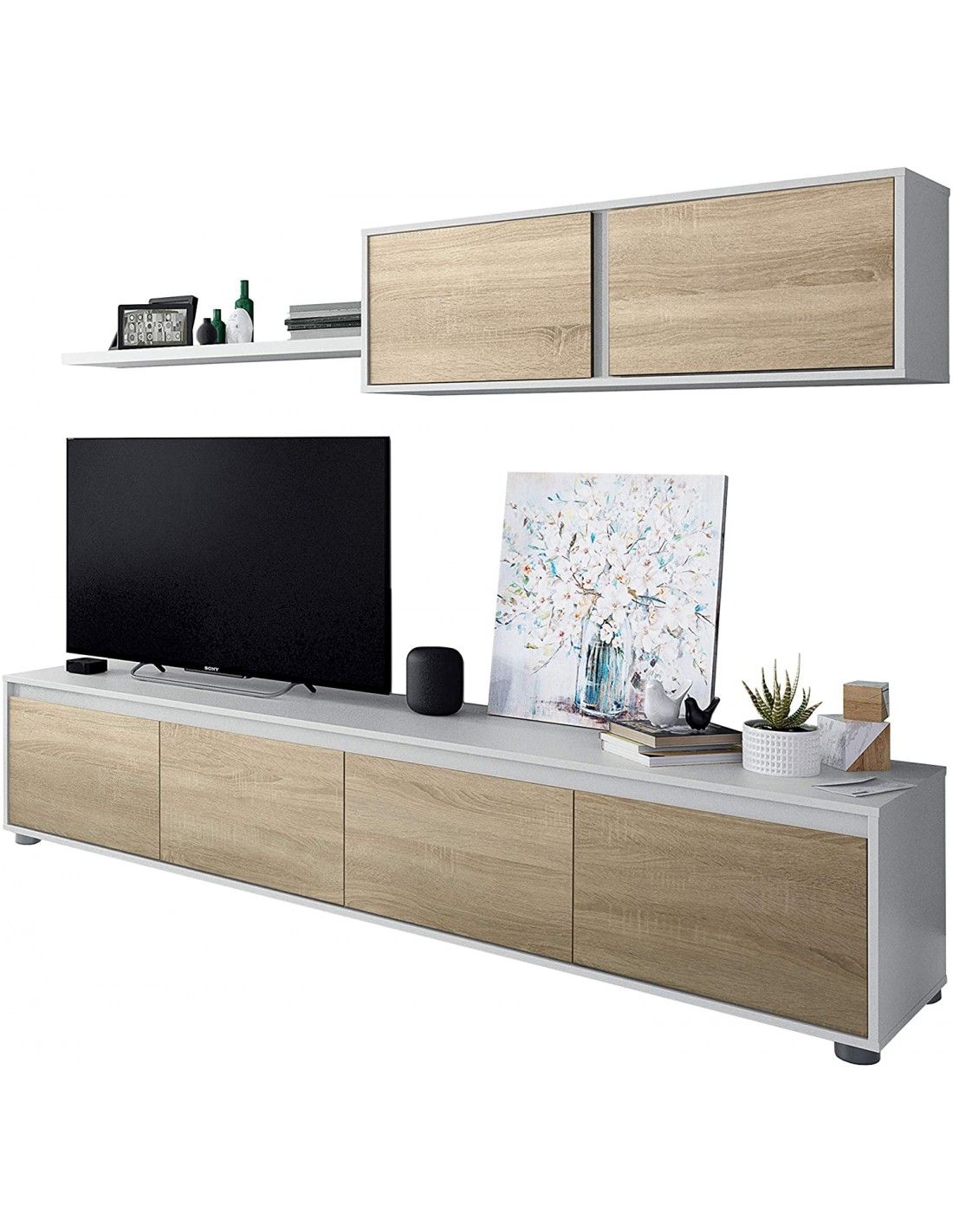 - Conjunto para salón compuesto de un mueble de televisión con 4 puertas y un módulo superior de 2 puertas y un estante de colgar.