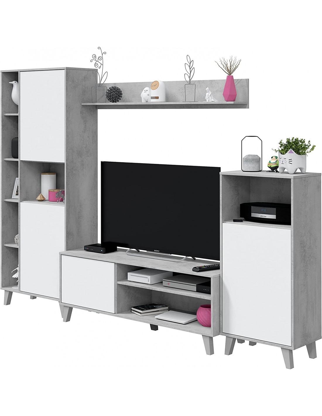 Conjunto para salón compuesto de 3 muebles con patas a juego y un estante de colgar. Los módulos consisten en un mueble de televisión de una puerta y dos huecos - una vitrina alta de dos puertas con huecos - una estantería pequeña con una puerta y hueco y un estante de colgar.