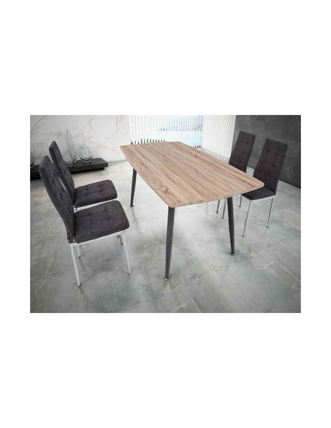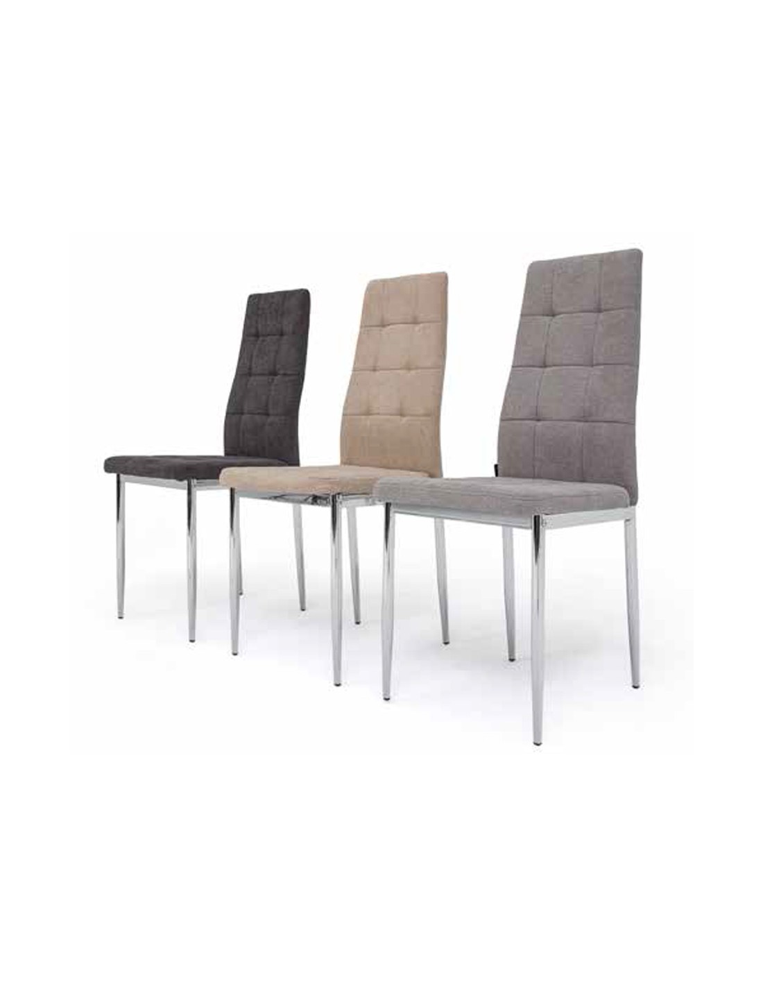 La silla Katia es un modelo diseñado a partir de líneas rectas que aportan firmeza al entorno que la rodea, pero adaptando su respaldo para proporcionar sensación de relajación y descanso. Una vez más el acero cromado de sus patas combina a la perfección con los tejidos del tapizado aportando un equilibrio capaz de vestir el ambiente con calidad pero mirando por la economia.