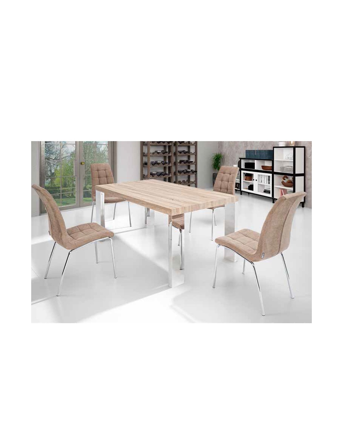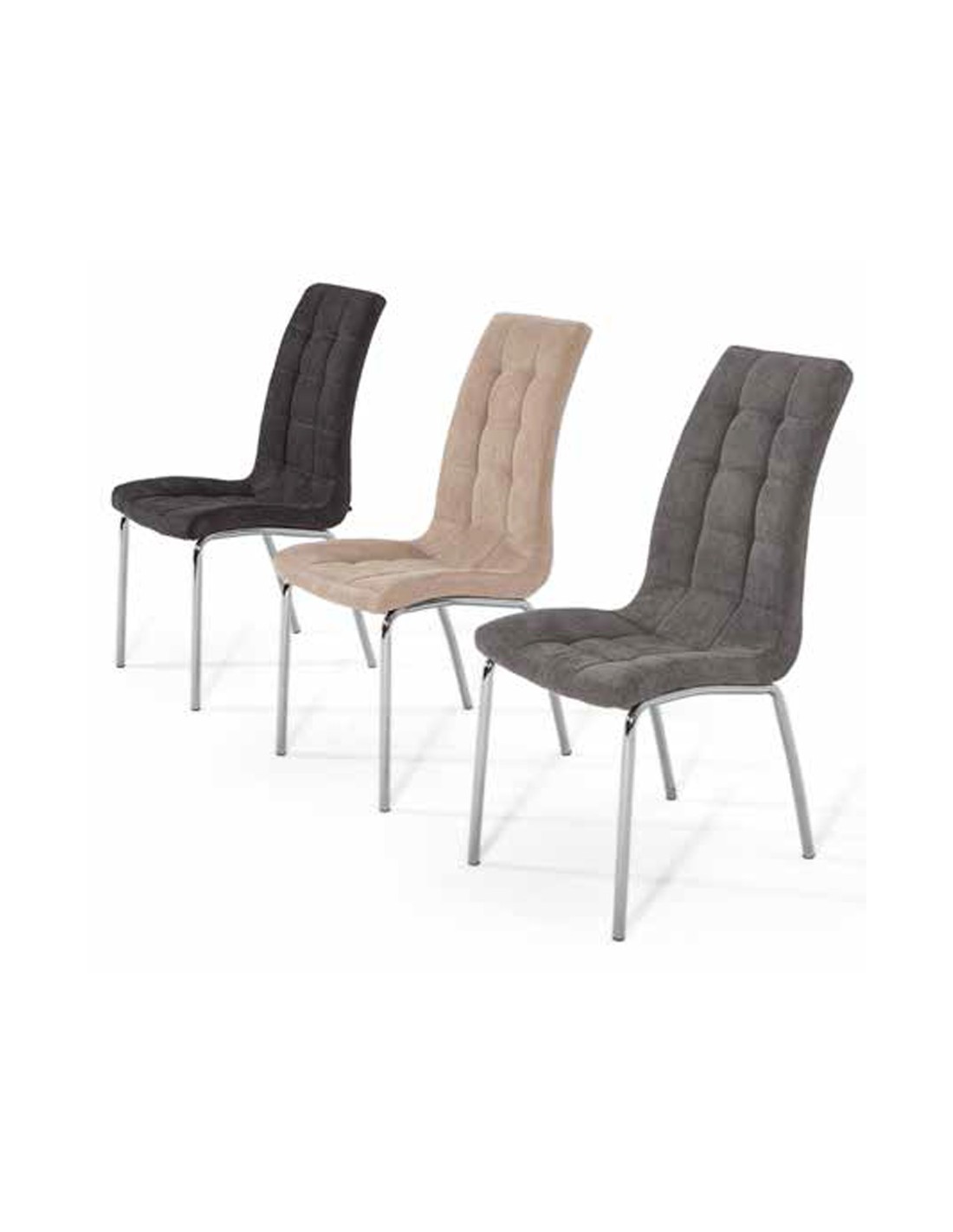 Tapizada en tejido con asiento y respaldo acolchados con grueso extra y patas cromadas, el complemento ideal para un comedor moderno y funcional.