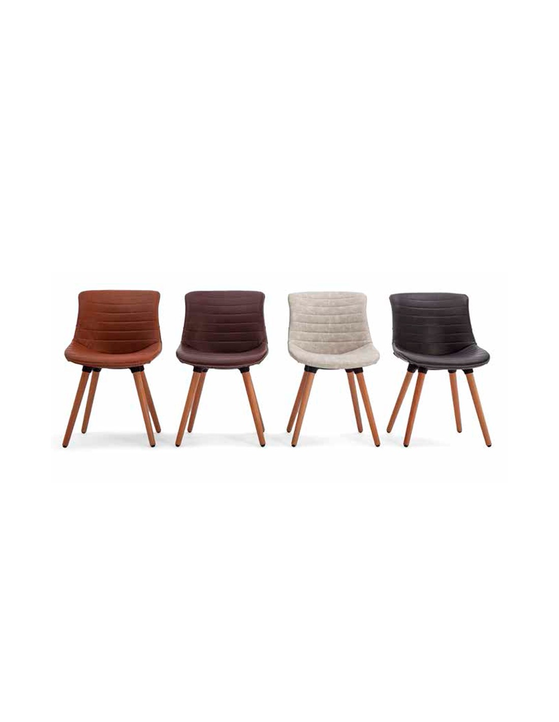Silla moderna y elegante, con patas de madera natural que también pueden lacarse. Asiento y respaldo acolchado.