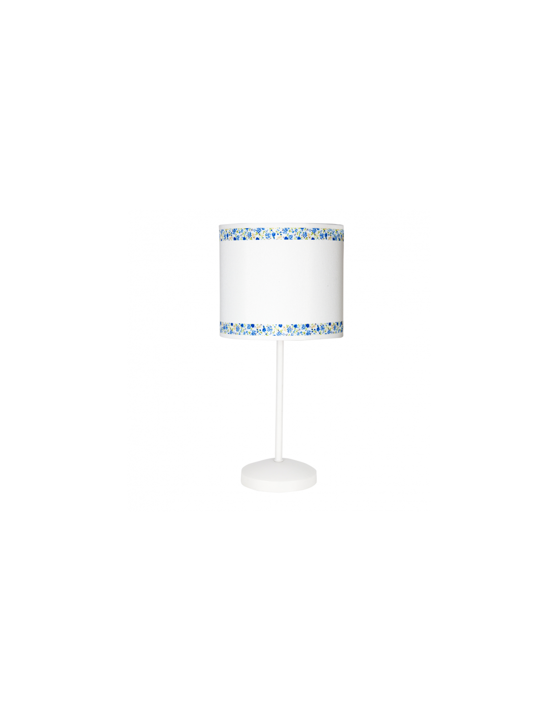 Sobremesa serie CENEFA de color blanco con detalles en azul. La pantalla es de 17 cm de diámetro con dos cenefas decorativas en tonos azules y verdes. El portalámparas es E14.