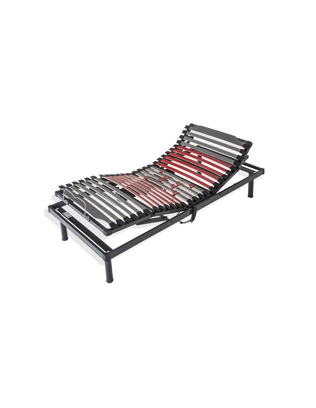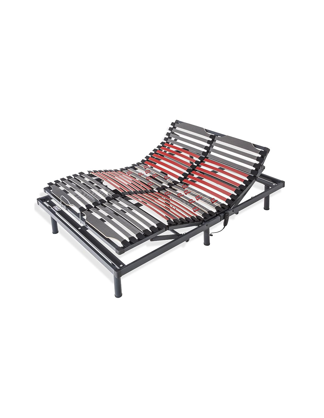 El somier articulado metálico permite un accionamiento independiente de cada parte. En medidas de matrimonio consta de dos lechos con articulación única de la zona cabecero y piecero. este modelo destaca por su gran resistencia y durabilidad. Cuenta con dos soportes de caucho antideslizantes y basculantes de suspensión activa sobre el bastidor y la barra central que ayudan a repartir el peso de forma más eficiente. Sus 24 láminas de madera ordenadas de dos en dos, junto al tercio central reforzado y con regulación lumbar, garantizan máxima adaptabilidad y elasticidad activa. Además, cuenta con un arquillo sujeta-colchón en piecero.