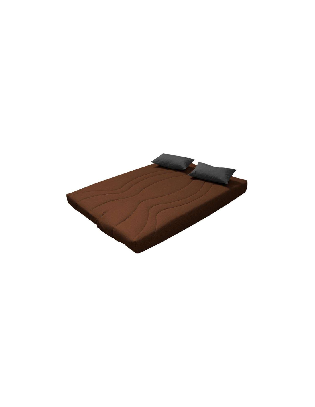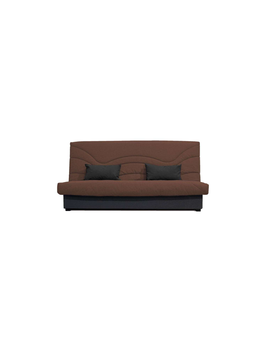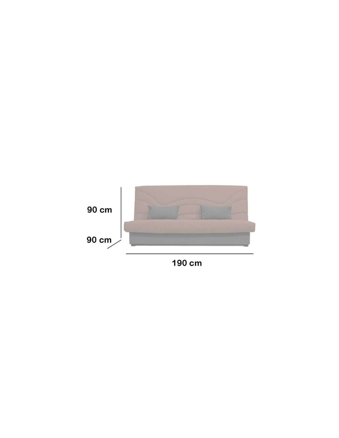 Sofá convertible en cama de 130 x 190 cms., sistema de empuje, con estructura de láminas de madera y colchonetas de poliuretano. Cajón guardarropa con fondo muy resistente. Desenfundable, fabricado en España.