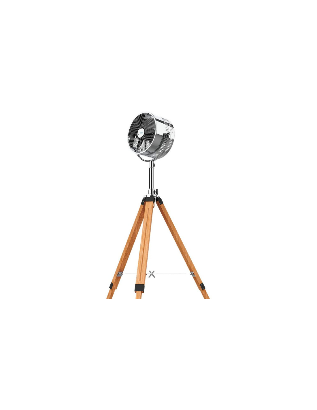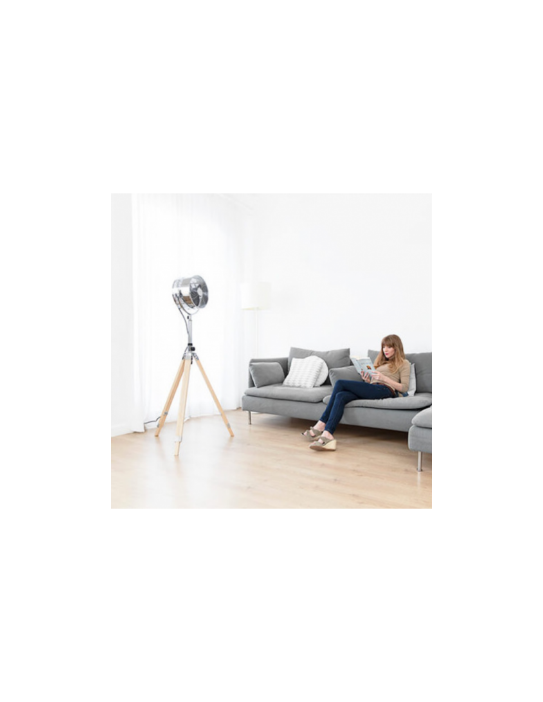 Su trípode elegante con patas de madera y el tambor que oculta las aspas crean una apariencia única y futurista que elevará instantáneamente el estilo de cualquier habitación.